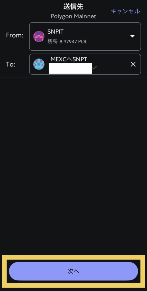 先ほど交換したSNPTをMEXCに送金する時に、ガス代としてPOLが必要になります