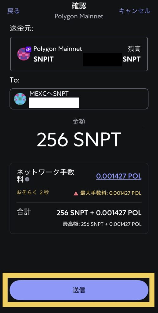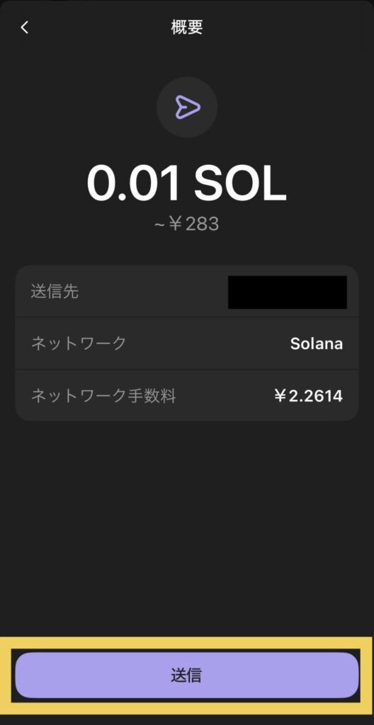 送信先・ネットワーク・手数料を確認してから「送信」をタップします