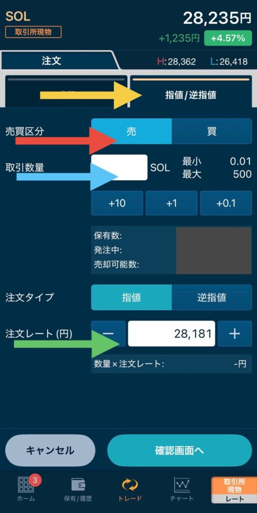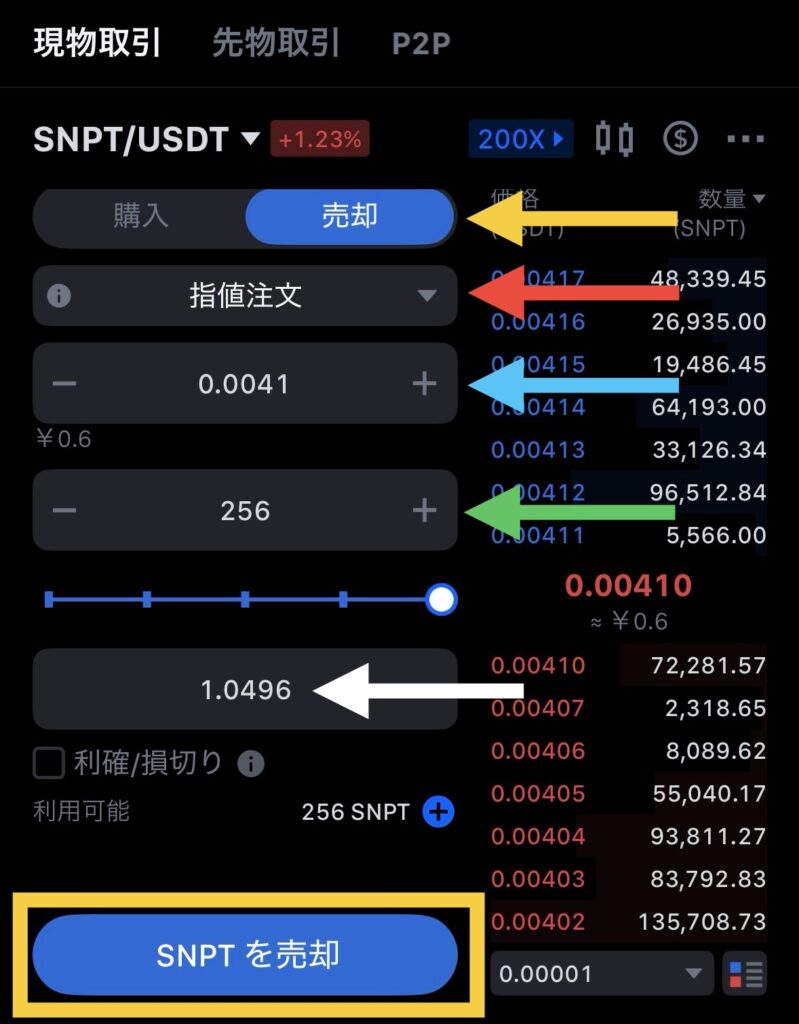緑色の矢印:売却したい価格を入力します(ー、+タップでも増減します)