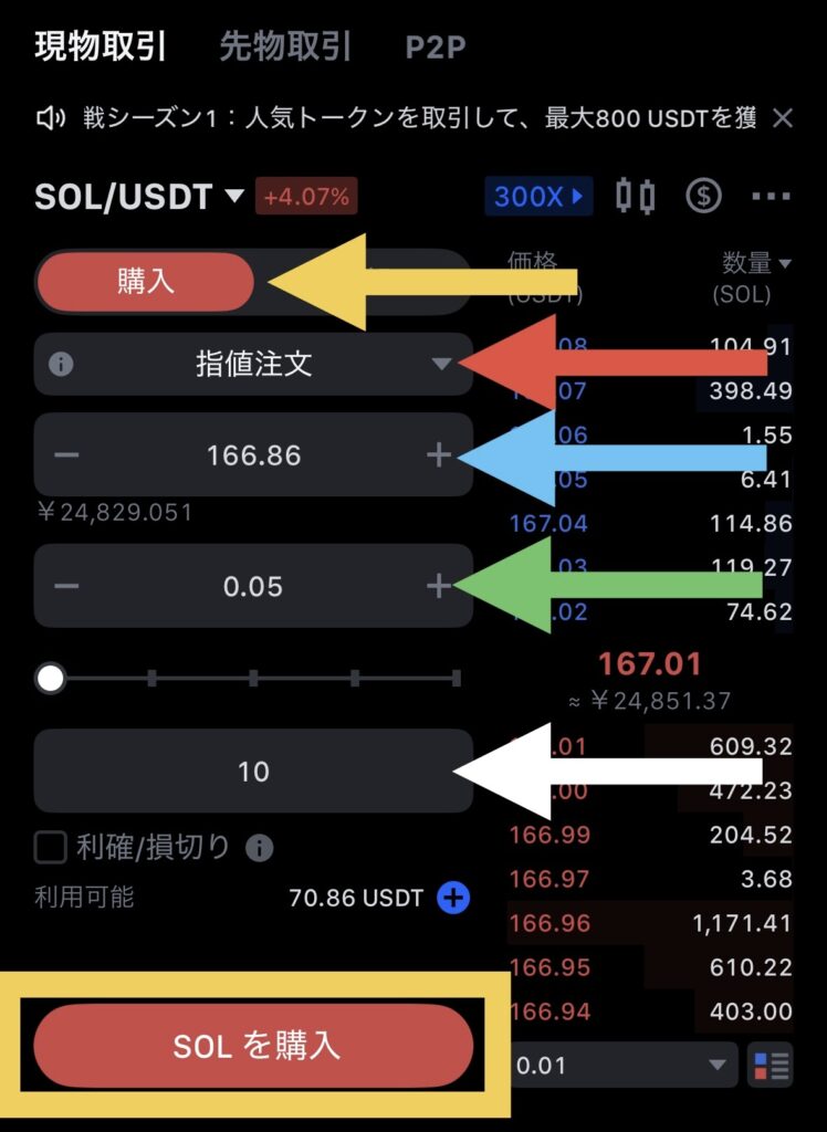 水色の矢印:購入したい価格を入力します(ドル表示なので注意)