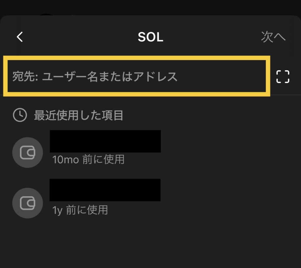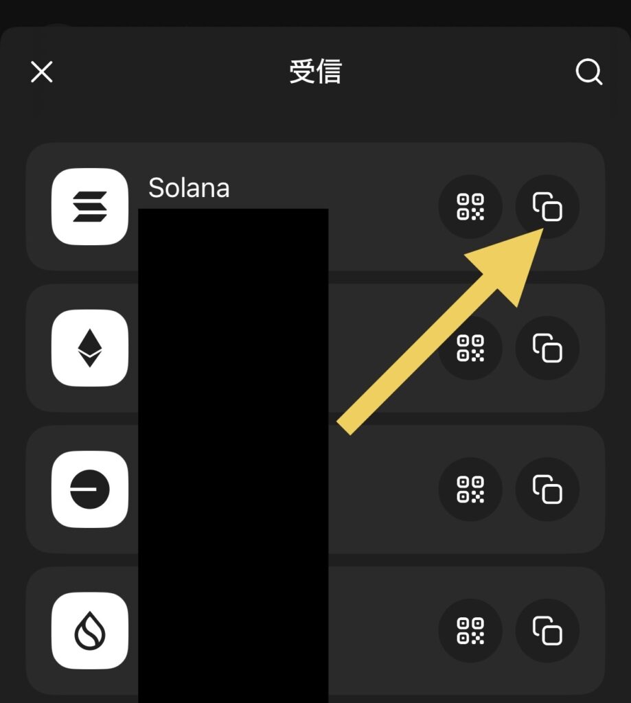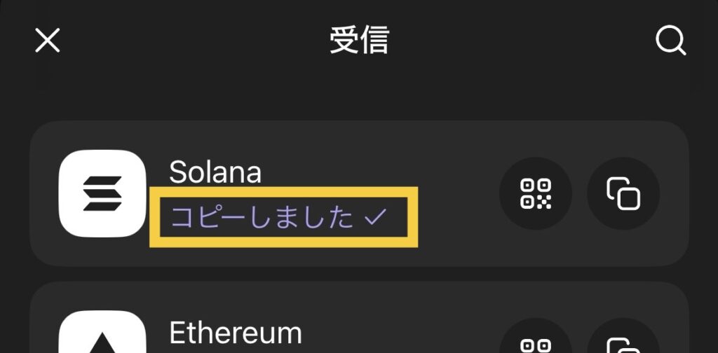 SOLを送金したいので、必ずSOLチェーンのアドレスをコピーします