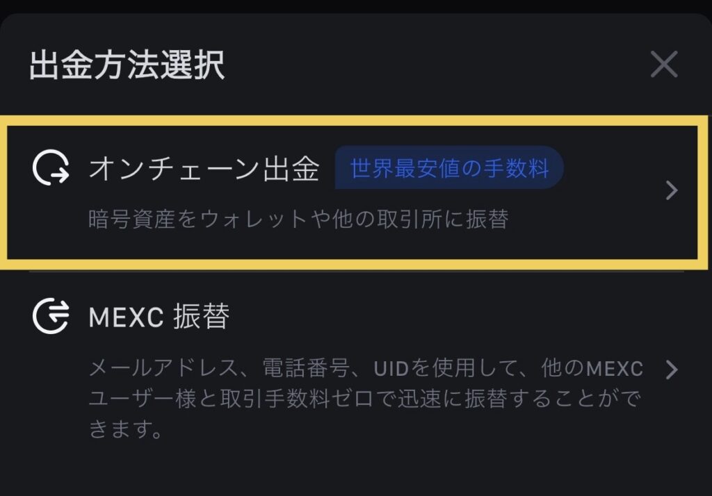 タップするとポップアップが出てくるので「オンチェーン出金」をタップします