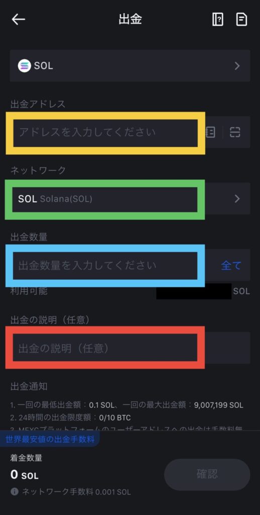 「出金数量」に出金したい数量を入力します(この時のネットワーク手数料は0.001SOL)