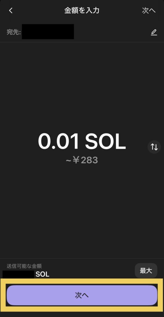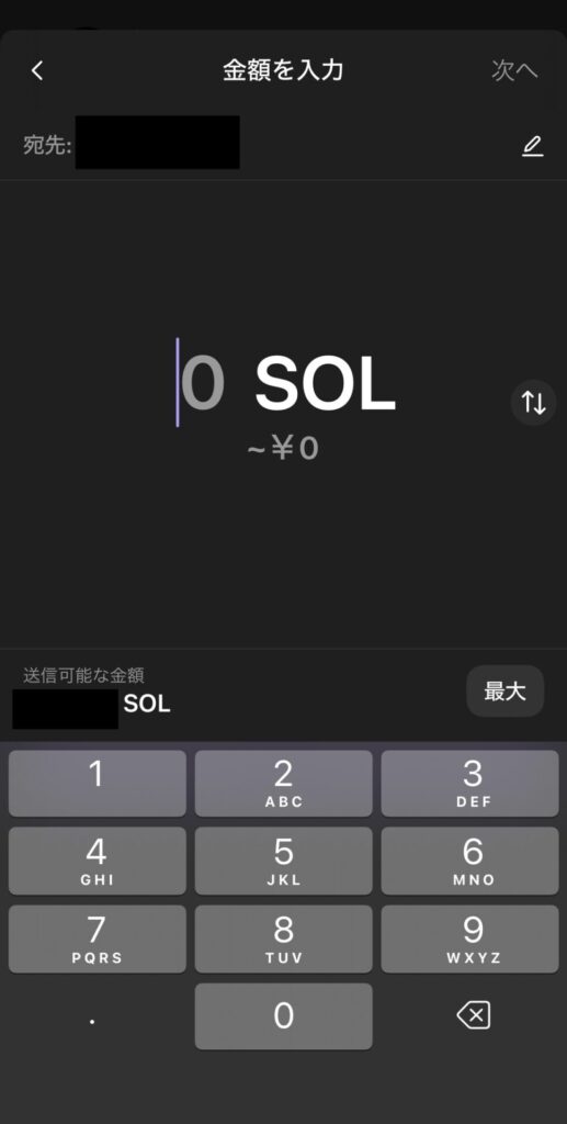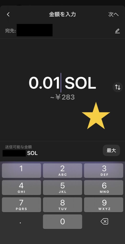0.1と入力すると、手数料の0.001が引かれて0.099SOLが送金されるので注意です