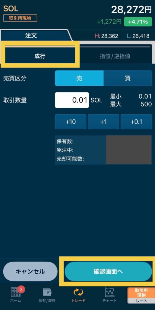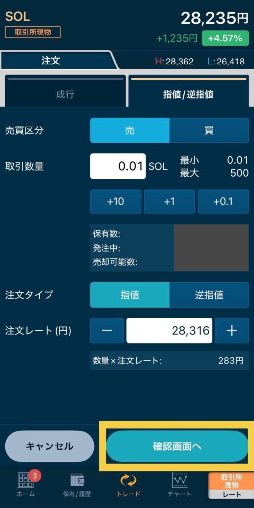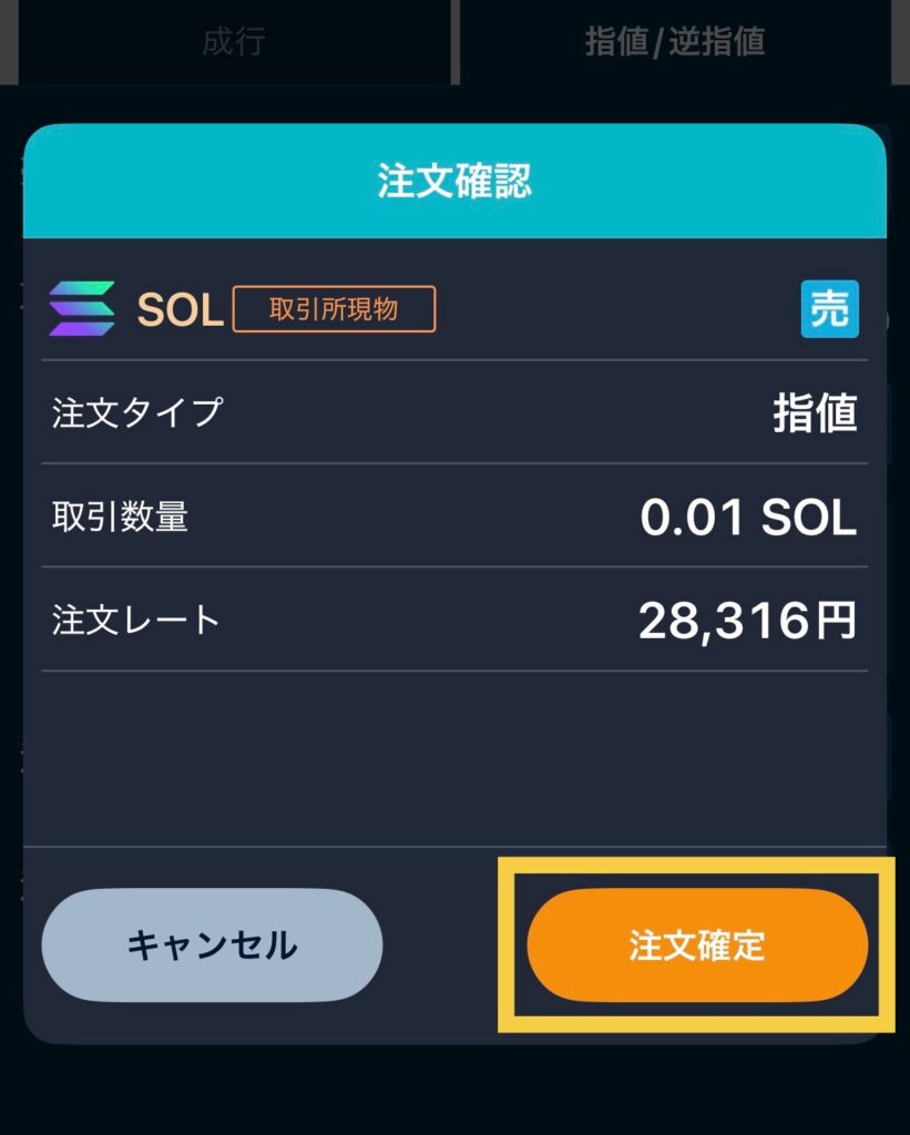 0.01SOLを28,316円で売却する注文を出してみます